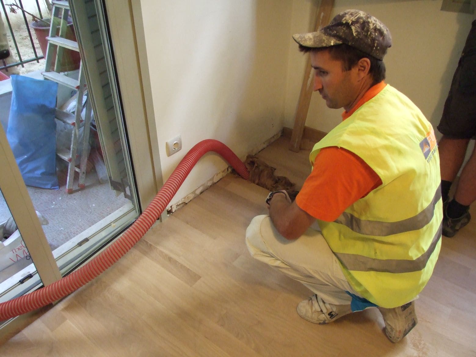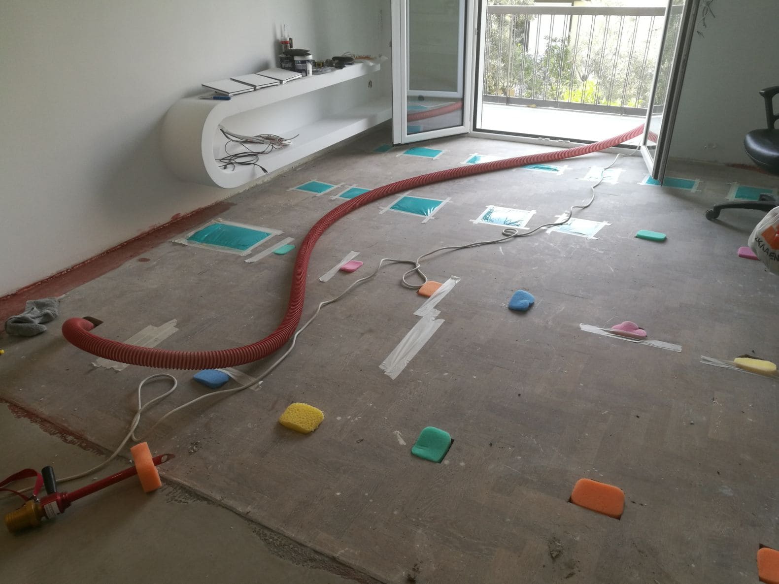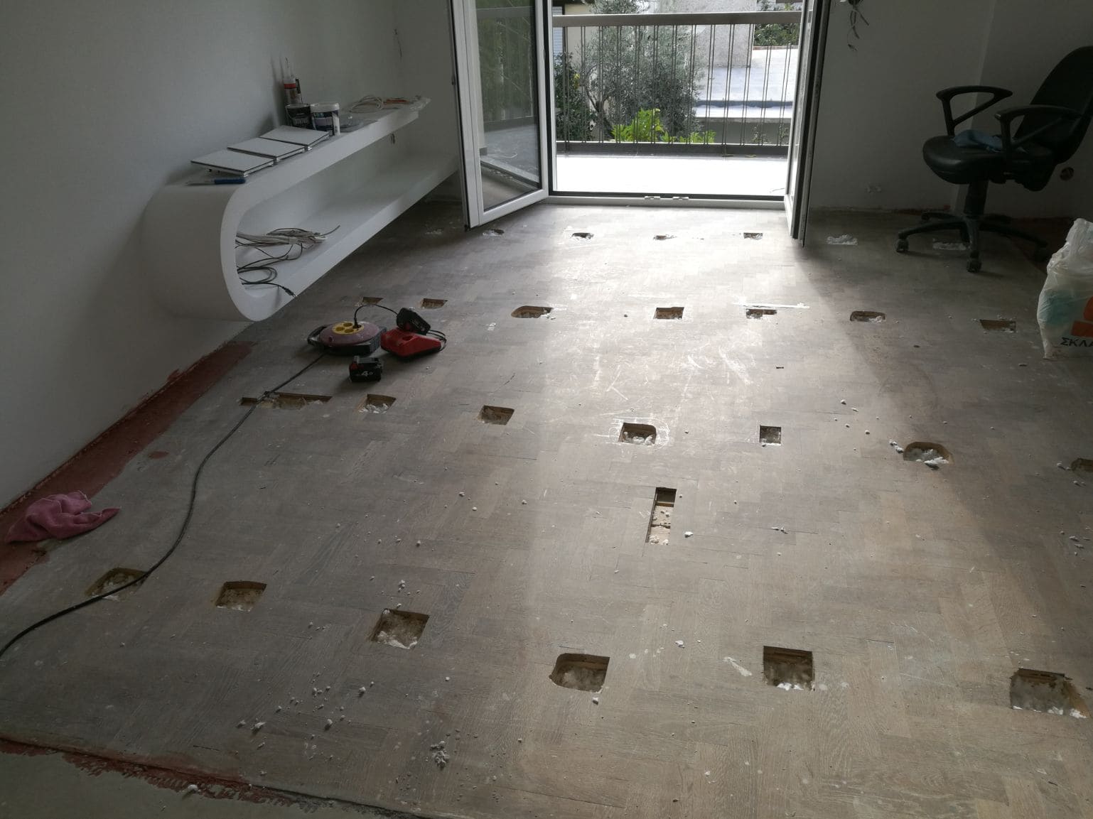 Ένα από τα προβλήματα που έχουμε αντιμετωπίσει σε αυτή την εφαρμογή είναι ότι σε πολλές περιπτώσεις υπήρχαν μπάζα και χώματα κάτω από το δάπεδο και ανάμεσα στα καδρόνια. Αν όμως το δάπεδο είναι καθαρό, μπορεί πολύ εύκολα να γίνει η πλήρωση του διακένου. Αν ξηλωθεί το πάτωμα και ξαναφτιαχτεί, τότε δεν συμφέρει να χρησιμοποιήσετε την τεχνική μας και τοποθετείτε με τα χέρια τα κατάλληλα θερμομονωτικά, αντικραδασμικά και ηχομονωτικά υλικά.